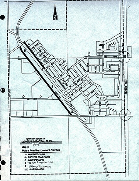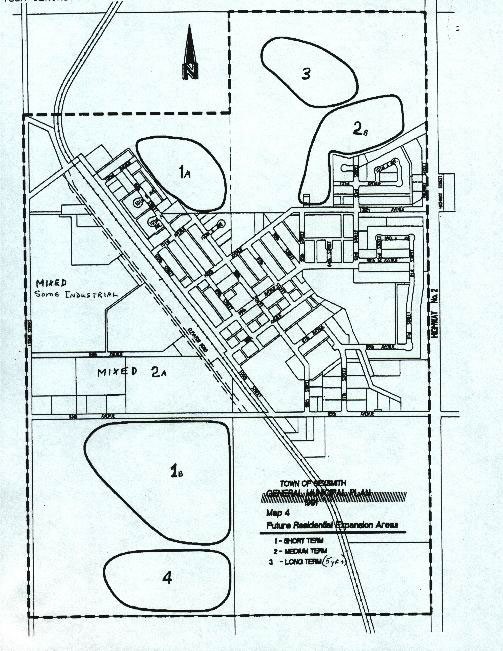 Within its current boundaries the Town has two major areas slated for future expansion. The first, located on the NE 25-73-06-W6M, consists of approximately 53.8 ha (133 ac) intended for residential, highway commercial, and public uses. This adopted in 1982. The second area consists of approximately 145.5 ha (360 ac) located on the NW and S 1/2 25-73-06 W6M. The West Sexsmith Area Structure Plan was adopted in 1982 for this area, outlining future industrial, commercial, residential, and public use development. NW 1/4 24-73-06 W6M and part of NE 1/4 24-73-06 W6M. These areas could accommodate a threefold increase in existing population of the Town.