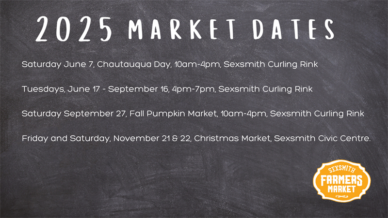Regular Season market dates, Tuesdays June 17 - September 16, 4pm-7pm, Sexsmith Curling Rink.